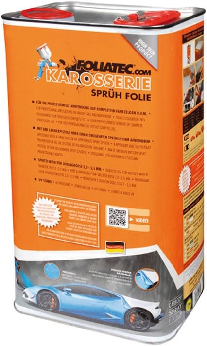 Foliatec Body Spray Film er en avtakbar sprayfolie som kan brukes til bilkarosseri. Påføres som et vanlig lakklag, den gir høy dekkevne, beskyttelse mot riper, salt og vær, og er UV-stabil. Når man ønsker å endre farge eller tilbakeføre originalfarge, kan belegget fjernes helt uten å skade lakken under.